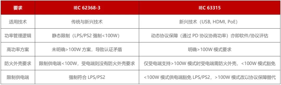 IEC 63315最新進展和發(fā)布日期 如今歷時6年,IEC 63315于近日已完成CDV投票階段,2025年7月31日進入Enquiry階段,計劃于2026年7月31日正式發(fā)布。 IEC 63315 要點解讀 IEC 63315的核心創(chuàng)新在于引入?yún)f(xié)議保障(Protocol Safeguard)機制,取代了舊標準的靜態(tài)功率限制。 上述動態(tài)協(xié)議保障要求采用的是USB Power Delivery specification 3.1和USB PD Compliance Test Specifications。也就是說此標準明確接受USB PD 3.1協(xié)議,而廠商的私有協(xié)議和其他協(xié)議是否滿足該標準要求可能需要測試后才能給出結(jié)論。 綜上,對于供電端和受電端設備: 1. 支持>100W輸出的供電端設備(如充電器/外部電源,充電寶)需要通過協(xié)議保障測試,驗證其能依據(jù)不同的受電端設備,安全的、動態(tài)的調(diào)整輸出功率; 2. 供電端設備可以移除冗余的LPS/PS2電路,增加協(xié)議芯片的容錯能力; 3. 受電端設備如果支持>100W輸入,必須采用防火外殼材料(如V-0阻燃材料); 4. 舊標準IEC 62368-3認證在不久的將來將逐步失效; 5. 歐盟Type-C強制法規(guī)EU 2022/2380的疊加效應:2024年12月起,歐盟強制消費電子采用USB Type-C接口,且>15W設備需支持PD協(xié)議。IEC 63315將成為高功率設備進入歐洲的實質(zhì)安全門檻; 6. 協(xié)議保障測試需增加軟硬件協(xié)同驗證,較傳統(tǒng)安規(guī)測試成本會有不少提高; 7. 統(tǒng)一協(xié)議保障后,私有協(xié)議市場將面臨極大挑戰(zhàn)(如部分筆電廠商的專屬快充協(xié)議); 8. 考慮IEC 63315計劃的發(fā)布時間,各廠商應該要調(diào)整認證計劃以應對2026年可能面對的全球強制實施措施。