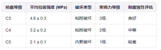 C4等級(jí):附著力下降33%(3.2 MPa),破壞類型仍為粘附破壞,但強(qiáng)度顯著降低,表明在重度腐蝕環(huán)境下,涂層系統(tǒng)需要更優(yōu)化的中間層。